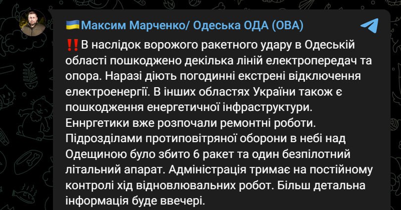 07:52 Під час нічної ракетної атаки зафіксовано обстріл енергетичних об'єктів у Київській, Миколаївській, Харківській, Запорізькій, Одеській, Дніпропетровській та Житомирській областях.