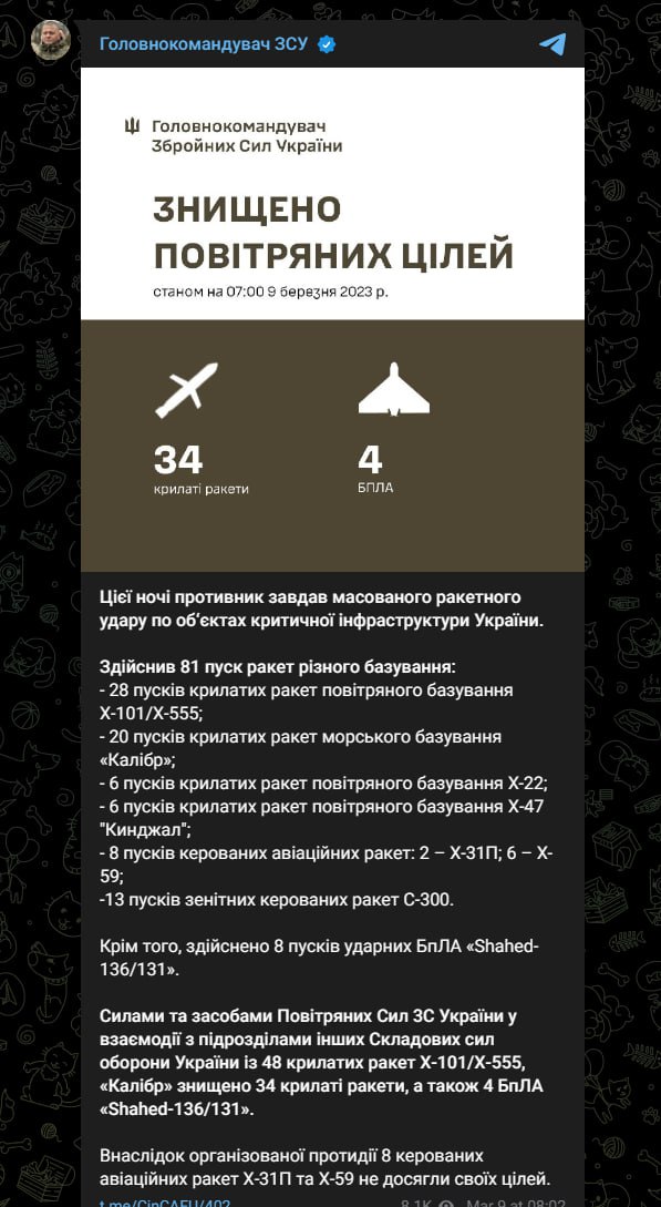 09:04 За даними головного комітету Валерія Залужного, цієї ночі противник здійснив 81 пуск ракети різного базування: