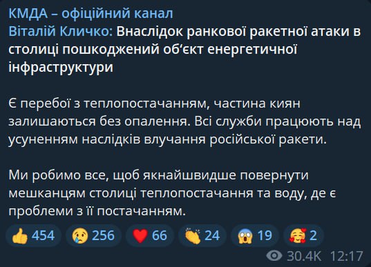 1. РФ завдала масованого ракетного удару по об'єктах критичної інфраструктури. Було запущено 84 ракети різного базування, 34 з них знищено, ще 8 не досягли цілей. Також було нанесено 12 авіаударів, у тому числі вісім БПЛА типу «Шахед-136», чотири з них збили.