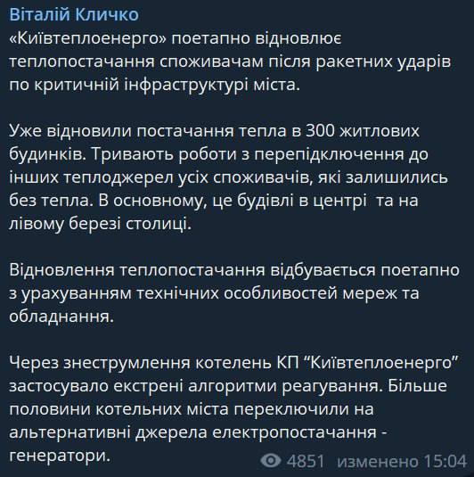 "Відновити тепло у повному обсязі комунальники планують протягом доби", - заявив мер Кличко.