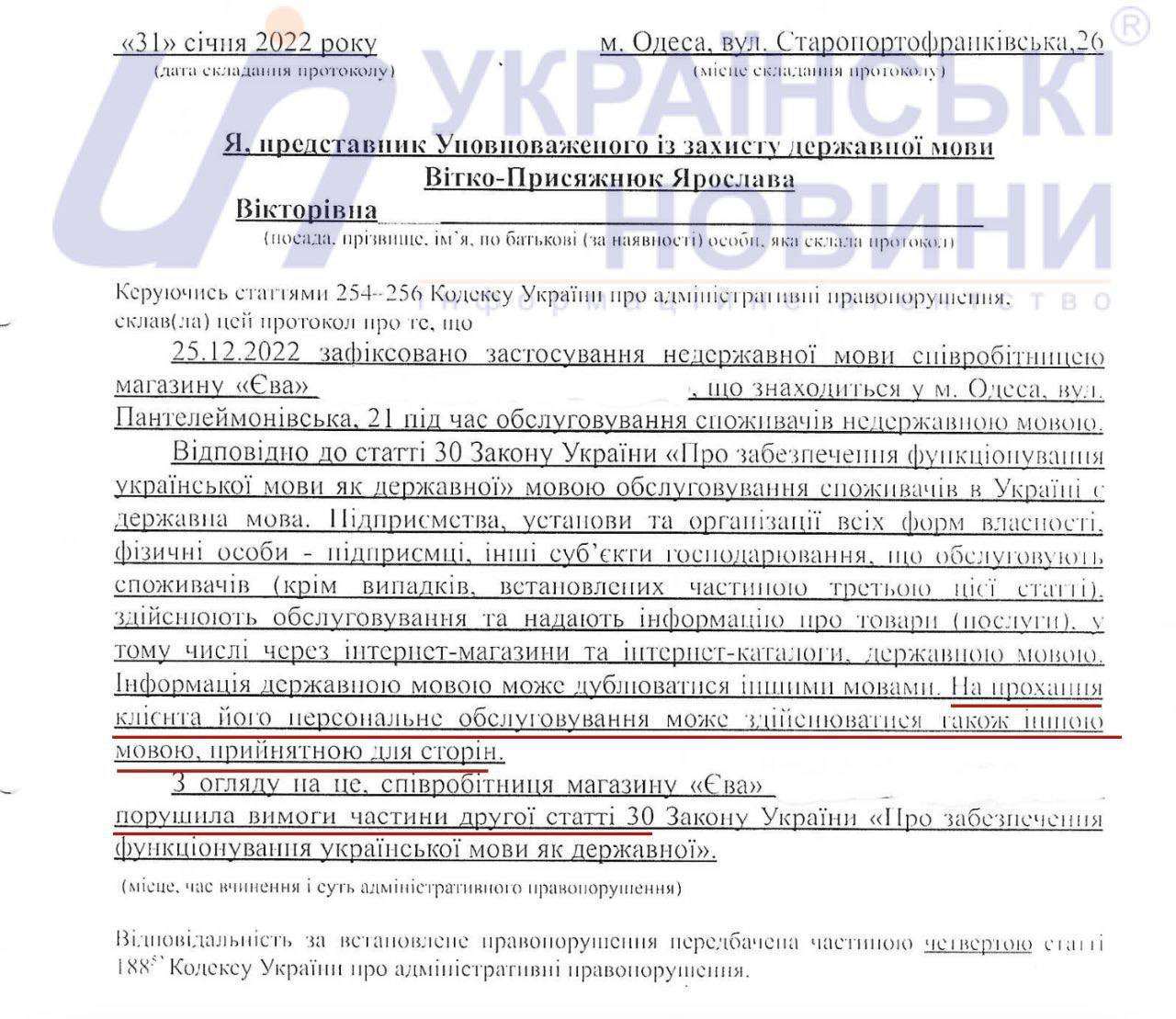 16.07 Мовний омбудсмен оштрафував касирку в Одесі за розмову російською. При цьому розмовляти російською не попросив клієнт. Він просив зволожуючий крем і не розумів слова "живильний".
