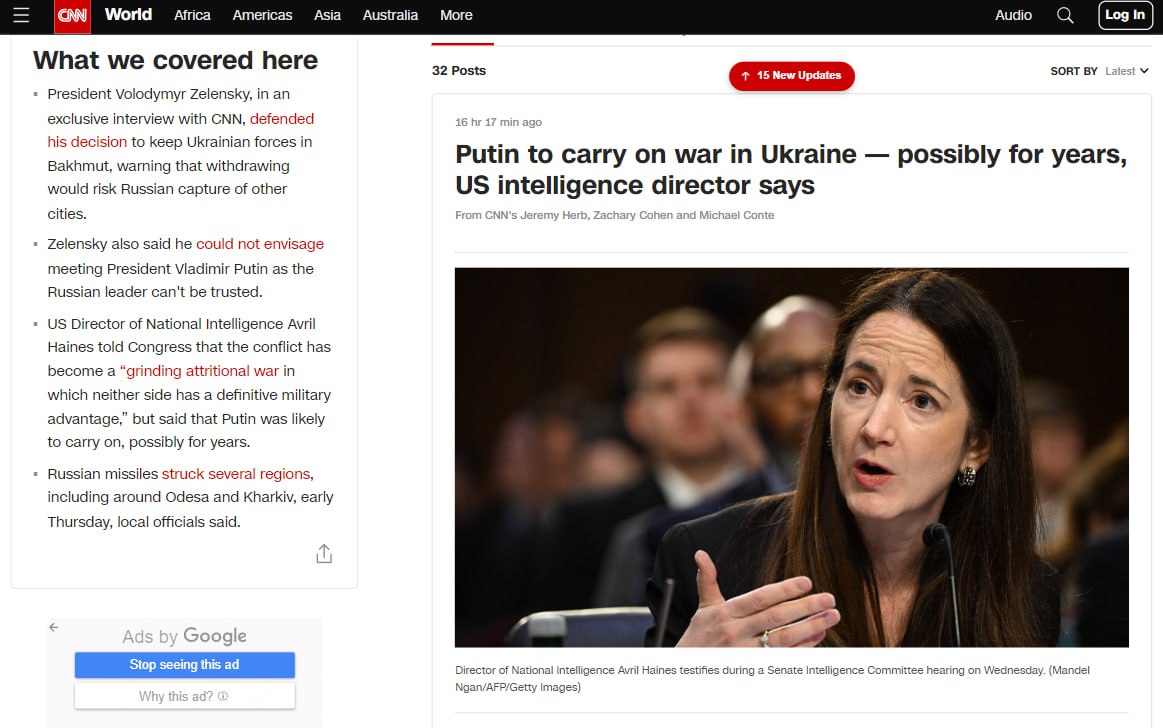 "Війна в Україні стала жорсткою війною на виснаження, в якій жодна сторона не має остаточної переваги, але Путін продовжуватиме. Можливо, роками", - заявила директор Національної розвідки США Евріл Хейнс у зверненні до Конгресу, передає CNN.