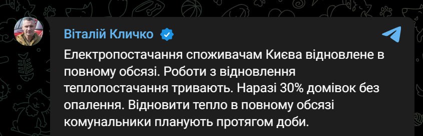 17.18 Електропостачання споживачам Києва поновлено повністю. При цьому 30% будинків залишаються без опалення.