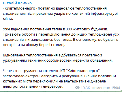 Вже відновили постачання тепла до 300 житлових будинків. Продовжуються роботи з перепідключення до інших теплоджерел усіх споживачів, що залишилися без тепла. В основному це будівлі у центрі та на лівому березі столиці.
