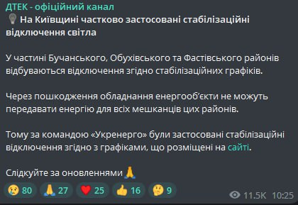 "У частині Бучанського, Обухівського та Фастівського районів відбуваються відключення згідно з стабілізаційними графіками. Через пошкодження обладнання енергооб'єкти не можуть передавати енергію всім жителям цих районів. Тому за командою "Укренерго" були застосовані стабілізаційні відключення згідно з графіками, розміщеними на сайті", - йдеться у повідомленні.