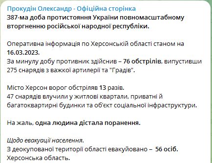 Про це повідомив голова Херсонської ОВ Олександр Прокудін.