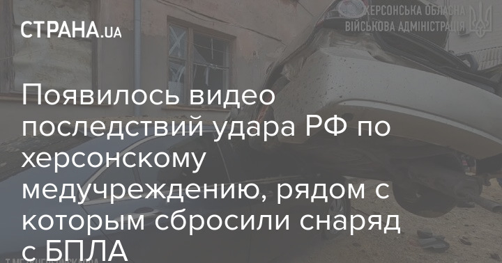 Херсонська ОВА публікує відео наслідків вчорашнього обстрілу медустанови в Херсоні, де внаслідок удару з безпілотника вибухом одну машину закинуло на іншу.