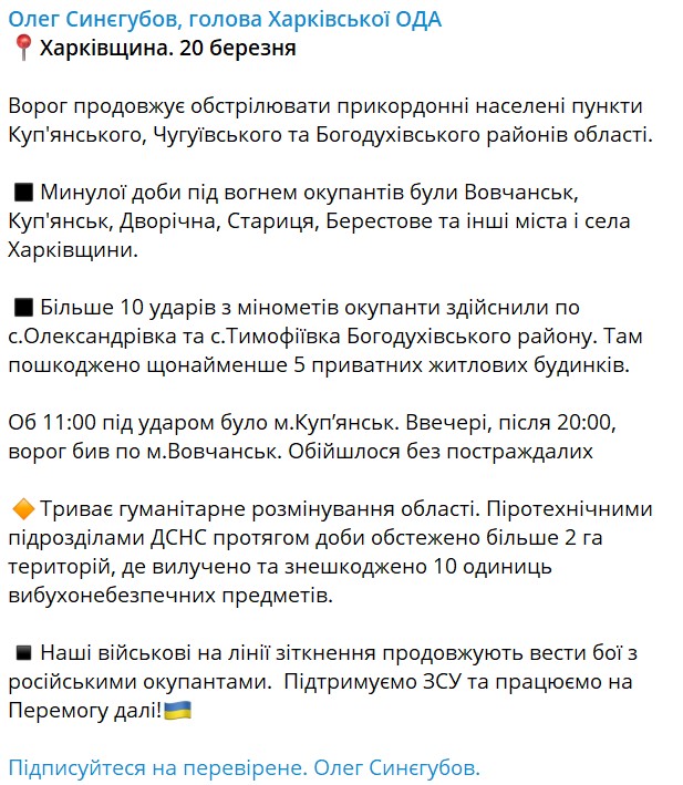 Про це повідомляє голова Харківської ОВ Олег Синегубов у телеграм-каналі.