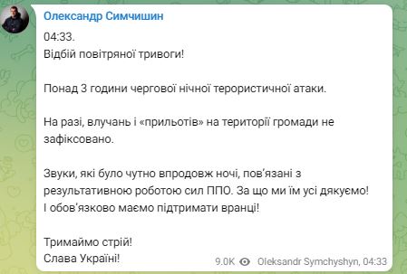 Мер Хмельницького Олександр Семчишин повідомив, що цієї ночі повітряна тривога та чергова атака РФ тривали понад три години.