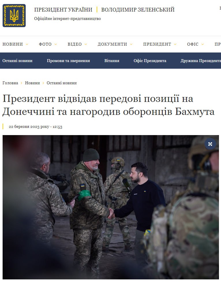 Також Офіс президента публікує відео відвідування Зеленським позицій поблизу Бахмута. На відео Зеленський дякує бійцям за захист держави і вручає їм нагороди.