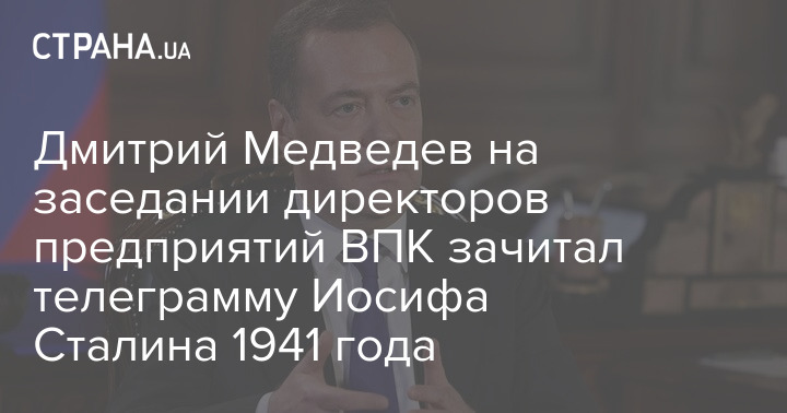 Заступник голови Ради безпеки РФ Дмитро Медведєв на засіданні директорів підприємств ВПК зачитав телеграму Йосипа Сталіна таким же директорам, датовану 1941 роком.