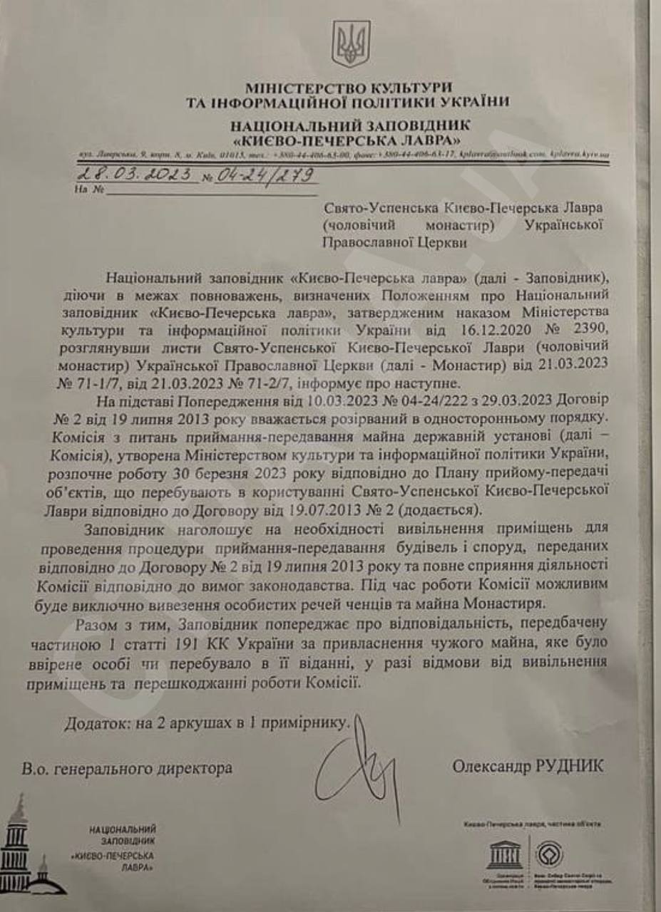 Міністерство ж направило ще вчора до Лаври листа, де повідомило, що 30 березня - тобто завтра - до монастиря прийде комісія, яка почне приймати держмайно і вимагатиме у ченців звільнити приміщення Лаври, а також вивезти особисті речі.