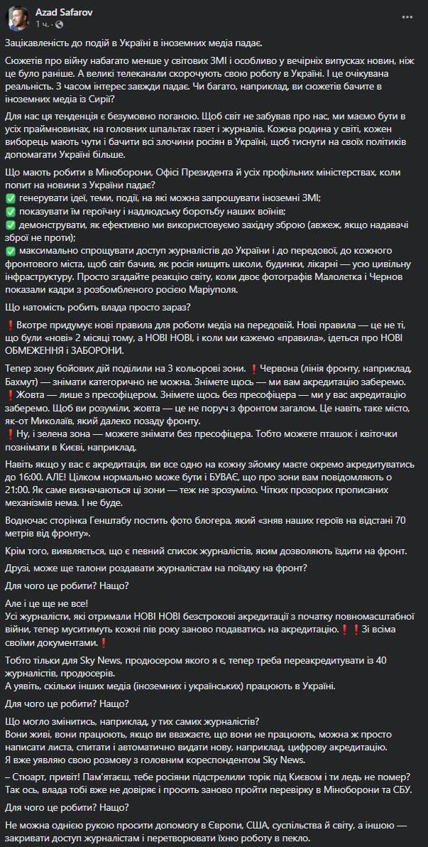 Продюсер Sky News Азад Сафаров пише, що тепер усі журналісти мають оновлювати раз на півроку акредитації, які раніше мали безстроковий характер.