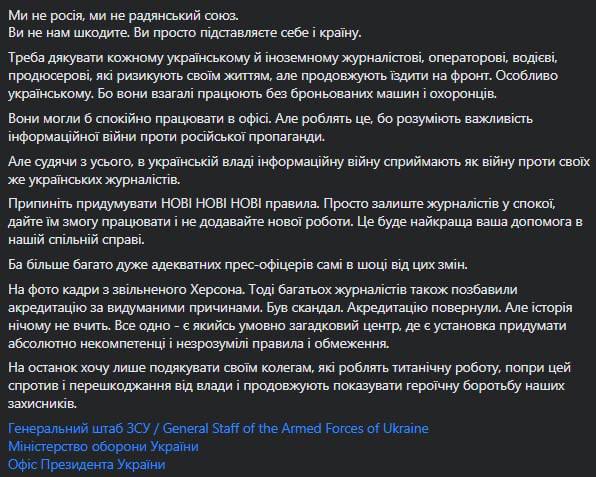 "Не можна однією рукою просити допомоги у Європи, США, суспільства та світу, а іншою – закривати доступ журналістам і перетворювати їхню роботу на пекло", - написав він.