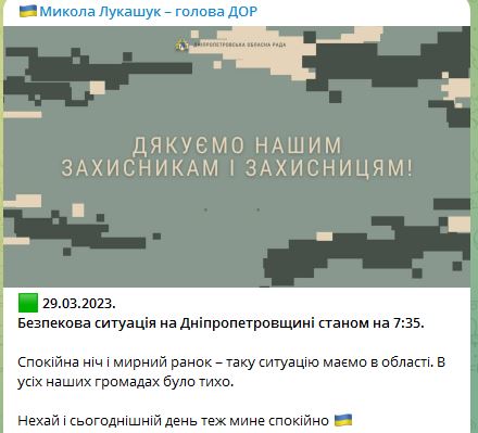 07.35 У Дніпропетровській ночі ніч пройшла без обстрілів, повідомляє обласна влада.