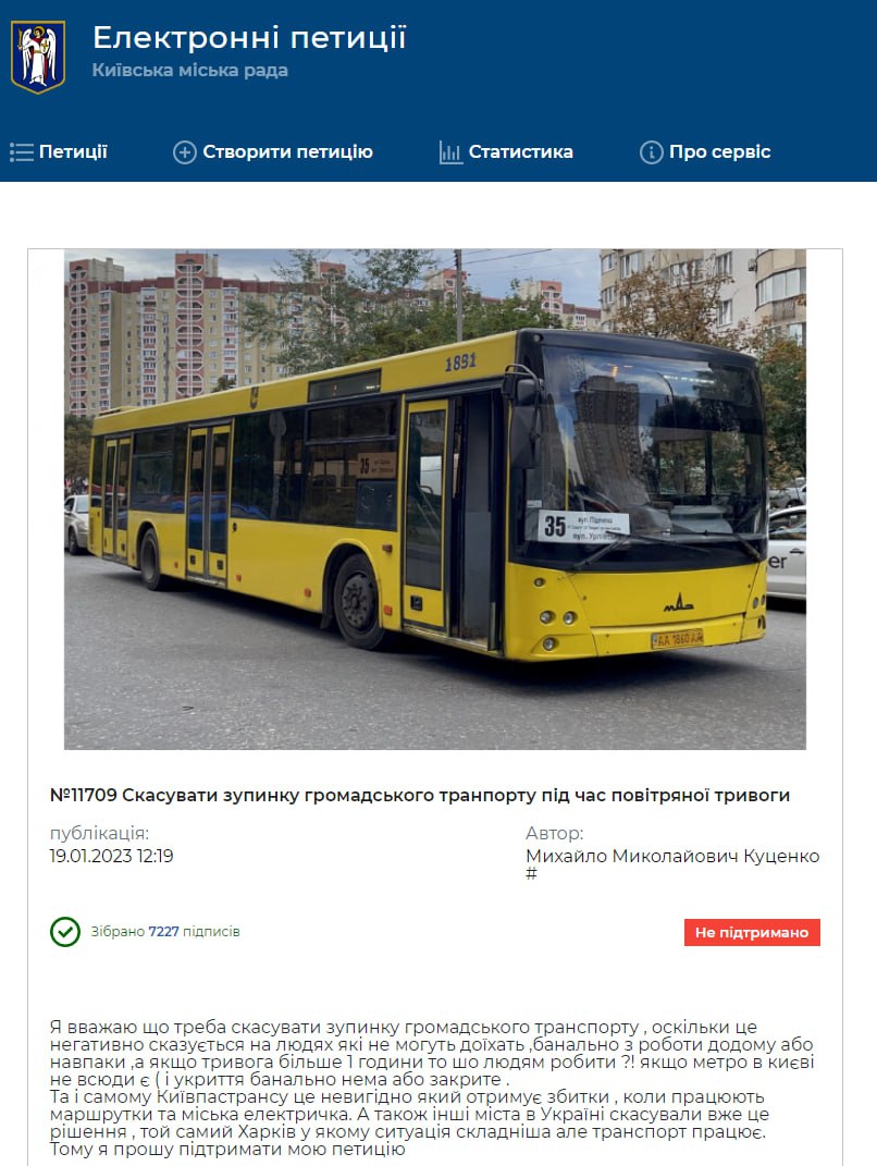 У відповіді петицію Кличко пише, що існуючий порядок встановлено законом, а зупинки не несуть додаткових витрат пасажирів, т.к. після закінчення тривоги пасажири можуть скористатися раніше оплаченими квитками.