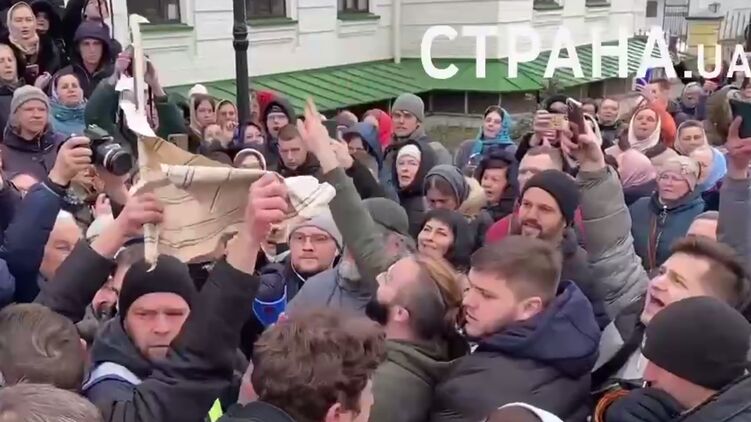 До віруючих Української православної церкви, які блокують прохід до Києво-Печерської лаври, підійшли кілька людей. Вони почали називати віруючих "окупантами" та "пособниками Росії". Один із них мав плакат із написом "Геть Росію з Лаври".