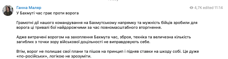 "Витрачені ворогом на захоплення Бахмута час, зброя, техніка та безліч загиблих з погляду військової доцільності не виправдовують себе. Втім, ворог не відмовився від своїх планів, пішов на принцип і підняв ставки на шкоду собі", - написала Маляр.