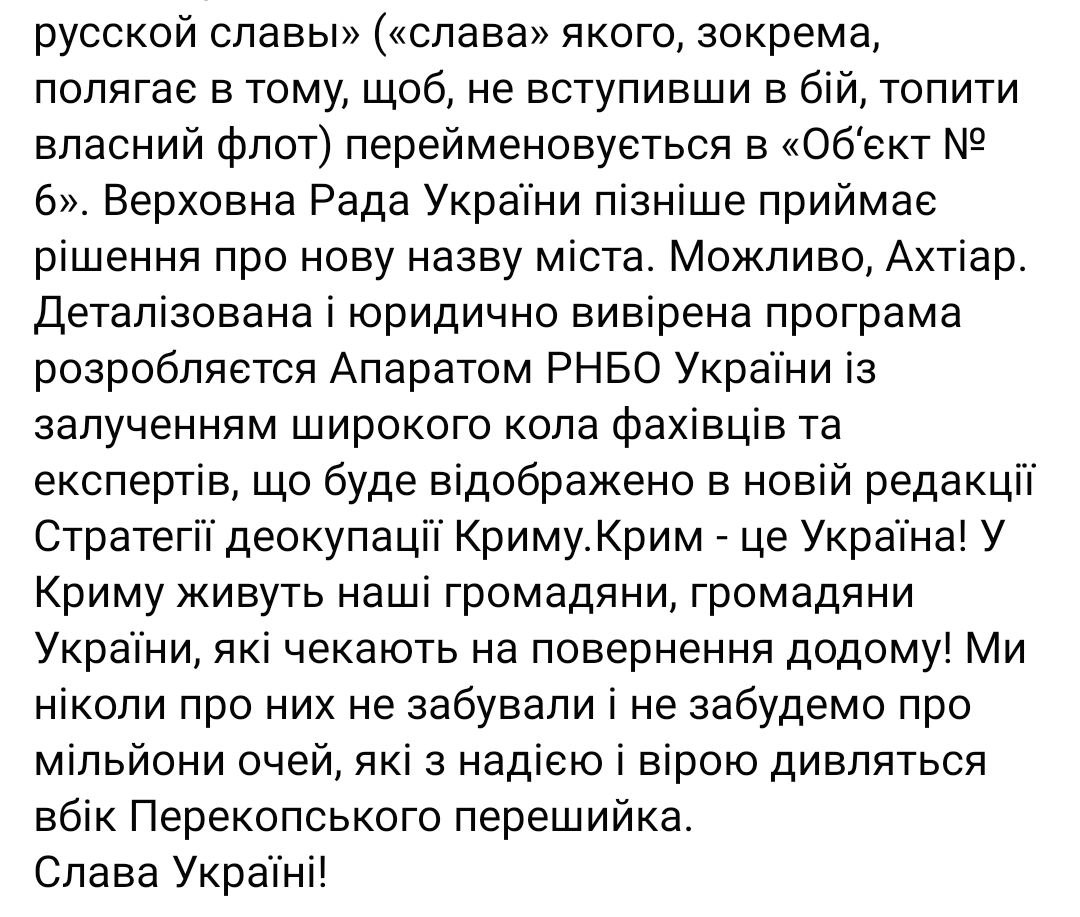 - Севастополь перейменувати на "Об'єкт номер 6", а потім, наприклад, на "Ахтіар" (так місто називалося наприкінці 18 - початку 19 століття).