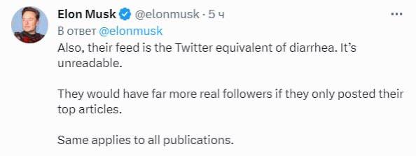 «Справжня трагедія New York Times полягає в тому, що їхня пропаганда навіть нецікава... Крім того, їхня стрічка — це твіттер-аналог проносу. Це нечитабельно. У них було б набагато більше реальних передплатників, якби вони публікували лише свої найкращі статті», - заявив Маск.