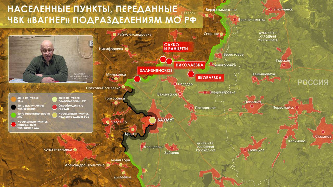 Куратор ПВК у свою чергу опублікував карту, де на лінії фронту закінчується зона відповідальності "Вагнера". Виходячи з неї, "вагнерівці" тепер воюють лише в самому Бахмуті, а також на південному та північному фланзі на захід від нього. А напрямок на Сіверськ перейшов до ЗС РФ.