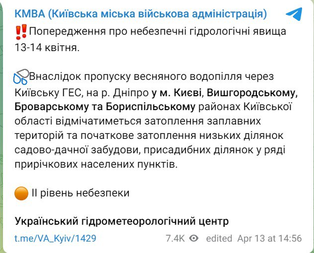 "Внаслідок пропуску весняної повені через Київську ГЕС, на річці Дніпро у Києві, Вишгородському, Броварському та Бориспільському районах Київської області відзначатиметься затоплення заплавних територій", - повідомила КГВА у своєму телеграм-каналі.