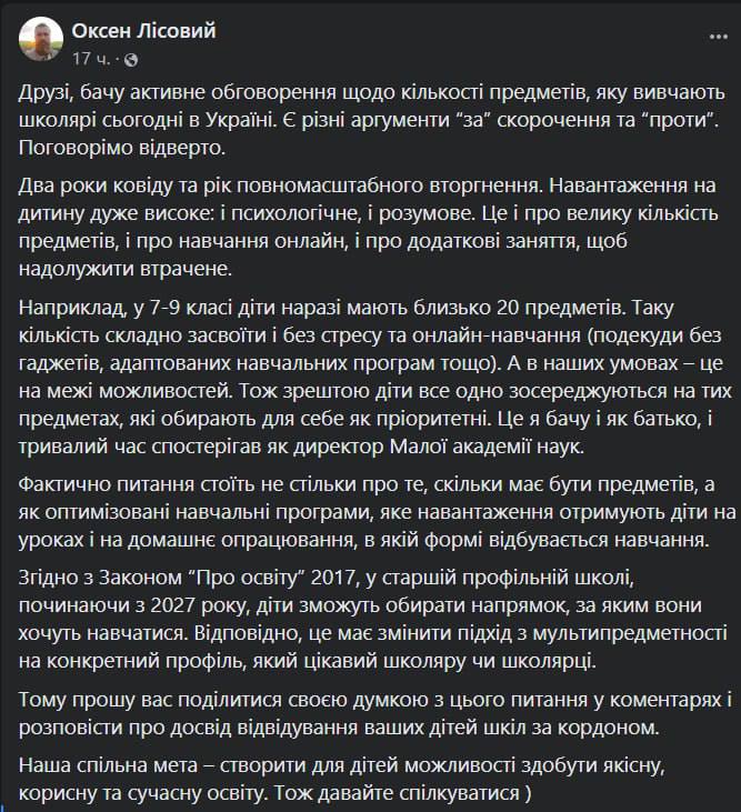 Новий міністр освіти Оксен Лісовий пропонує скоротити кількість предметів у школах. Цій темі він присвятив піст у себе у Фейсбуці.