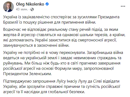 Спікер МЗС Олег Ніколенко заявив, що підхід президента Бразилії "не відповідає реальному стану речей", в якому жертва та агресор ставляться на однакові чаші терезів, а країни, які підтримують Україну, звинувачуються в заохоченні війни.