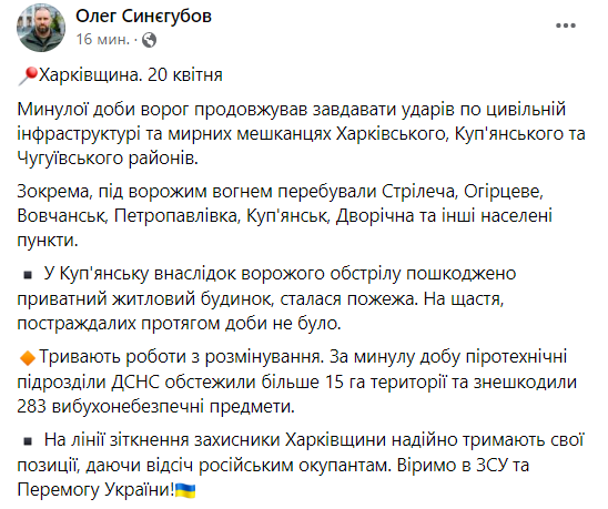 Тим часом війна в Україні триває вже 421 день. Ми слідкуємо за новинами 20 квітня у своєму онлайні.