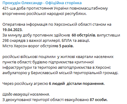 У Херсонській області було зафіксовано понад 60 обстрілів, у тому числі п'ять – у самому Херсоні. Постраждали житлові квартали, підприємство критичної інфраструктури та амбулаторія. Шестеро людей отримали поранення.