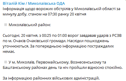 На Миколаївщині з РСЗВ ударили по Очакову, а також били по Миколаївському району.