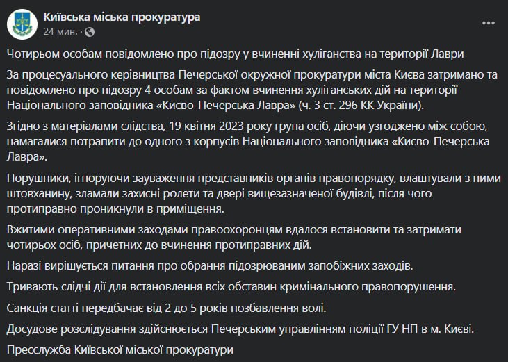 Чотирьох віруючих УПЦ затримали та повідомили їм про підозру після вчорашніх подій у Києво-Печерській Лаврі. Там, нагадаємо, хтось зламав ролет на приміщенні.