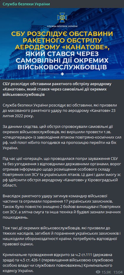 У спецслужбі повідомляють, що операцію не погоджували з відповідними органами, і вона призвела до того, що противник дізнався про місця розміщення особового складу Повітряних сил ЗСУ та українських літаків.