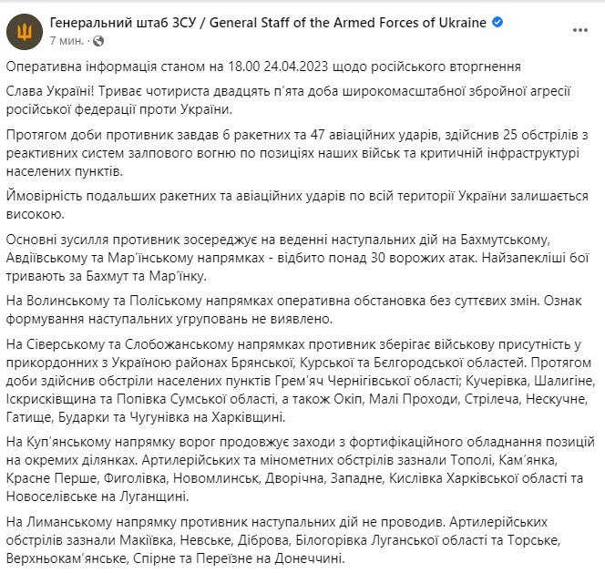 Війна в Україні триває вже 425 день. Ми слідкуємо за новинами 24 квітня у своєму онлайні.