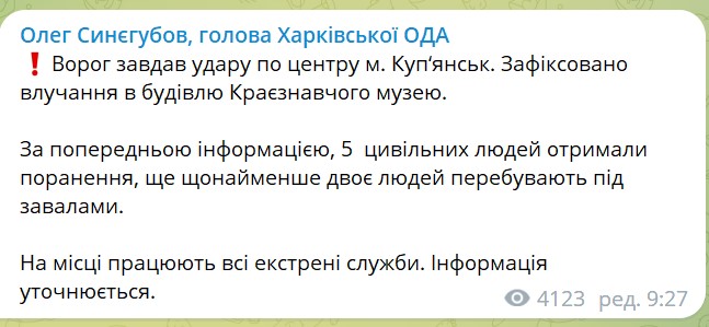 Росіяни обстріляли центр Куп'янська на Харківщині ракетами С-300. Потрапили до Краєзнавчого музею.