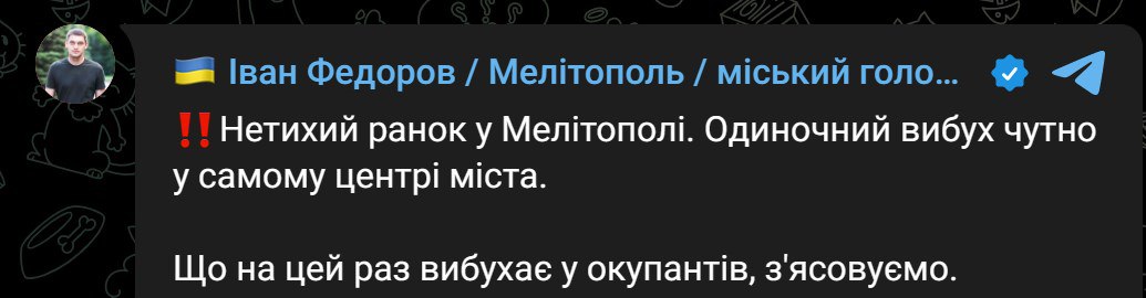 У центрі Мелітополя сьогодні вранці пролунав вибух. Про нього повідомив як український мер Іван Федоров, так і російські ЗМІ.