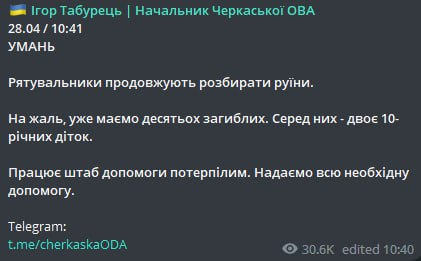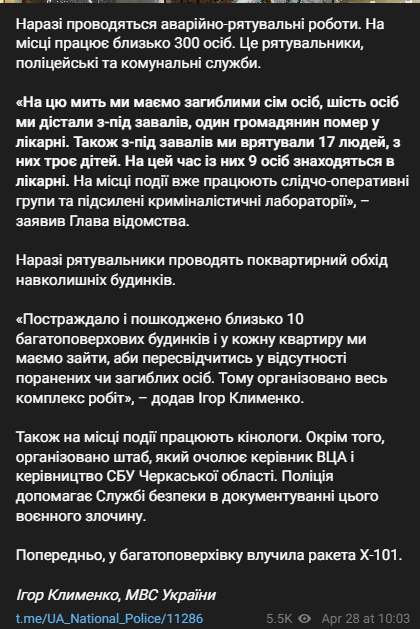 Нагадаємо, сьогодні, 28 квітня, в Умані Черкаської області від масованої ракетної атаки РФ постраждали 10 житлових багатоповерхівок. В одному з будинків знищено цілий під'їзд.