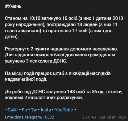 "Станом на 10:10 загинуло 10 осіб (з них 1 дитина 2013 року народження), постраждали 18 осіб (з них 11 госпіталізовано) та врятовано 17 осіб (з них троє дітей)", - йдеться у повідомленні.