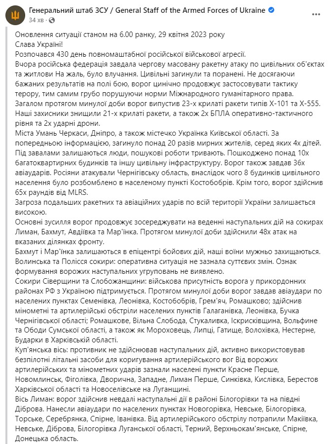 Генштаб ЗСУ опублікував оперативну інформацію про російське вторгнення станом на ранок суботи, 29 апеля.