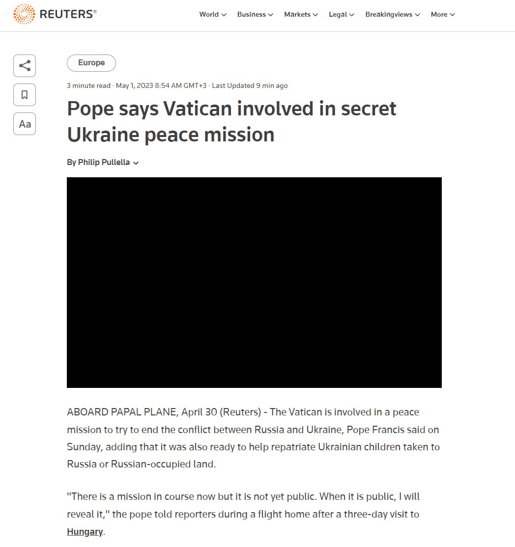 "Зараз йде місія, але вона ще не оприлюднена. Коли її буде оприлюднено, я розкрию її", - повідомив Папа Римський журналістам після візиту до Угорщини.