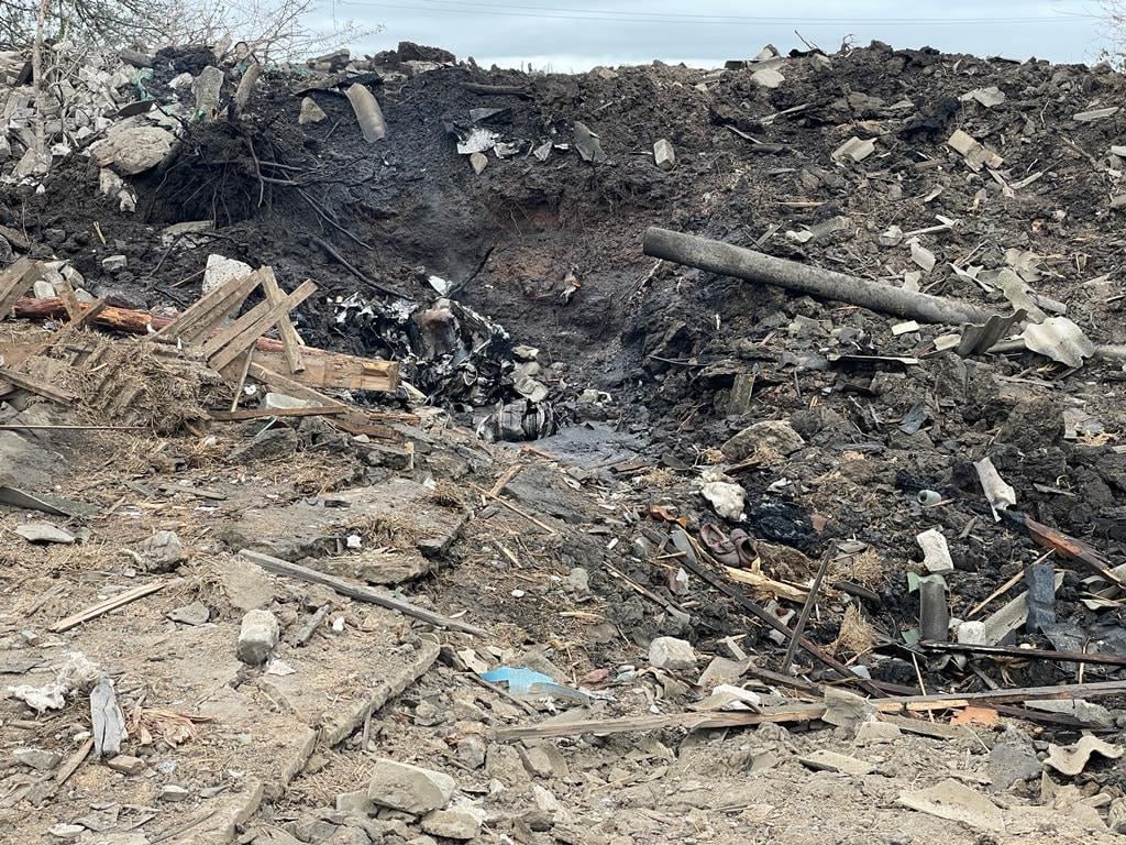 На фото видно пошкодження школи та велику вирву від снаряда в землі.