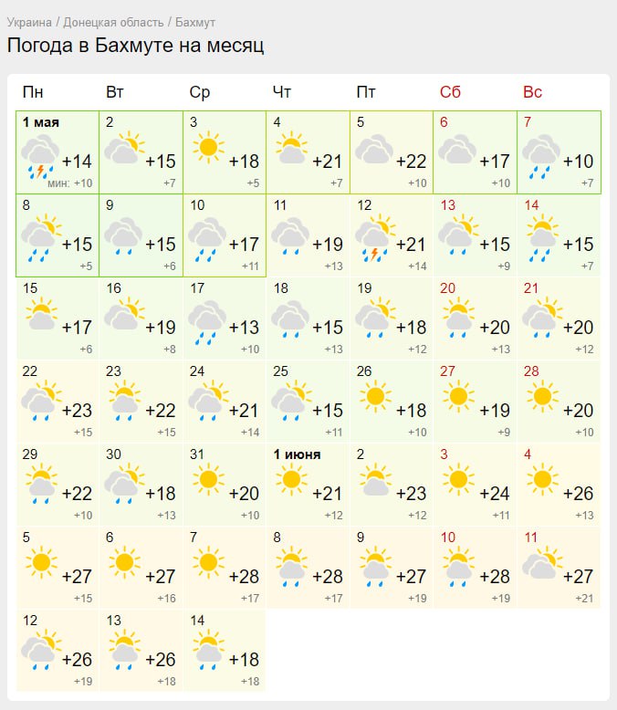 Раніше очікувалося, що суха погода буде вже на початку травня, а куратор ПВК "Вагнер" Пригожин прогнозував наступ ЗСУ до 15 травня, оскільки земля до цього часу мала б просохнути.