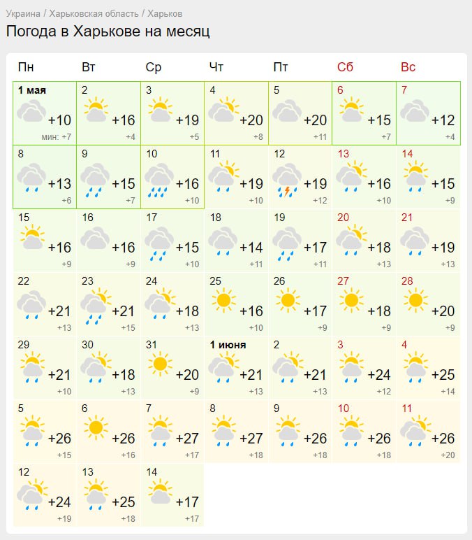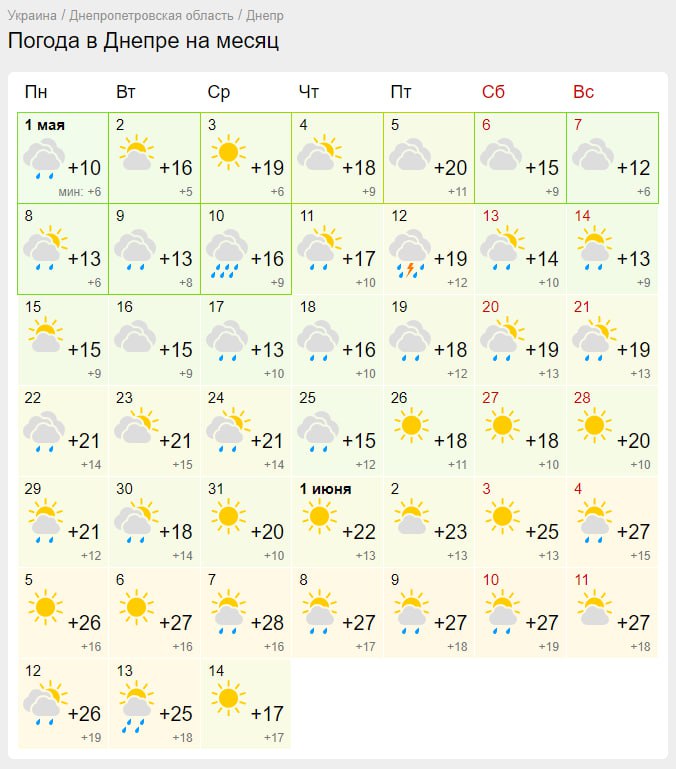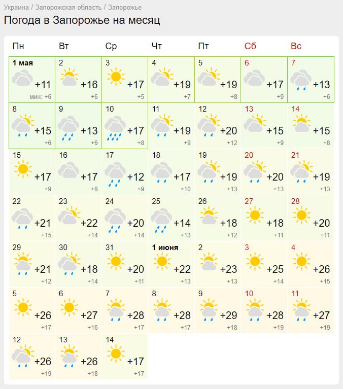 У прифронтовому Запоріжжі травень обіцяє бути достатньо дощовим протягом усього місяця: опади різної інтенсивності передбачаються щотижня по 2-3 дні. Найсухішим буде перший тиждень місяця: там дощ очікується лише у неділю, 7 травня.