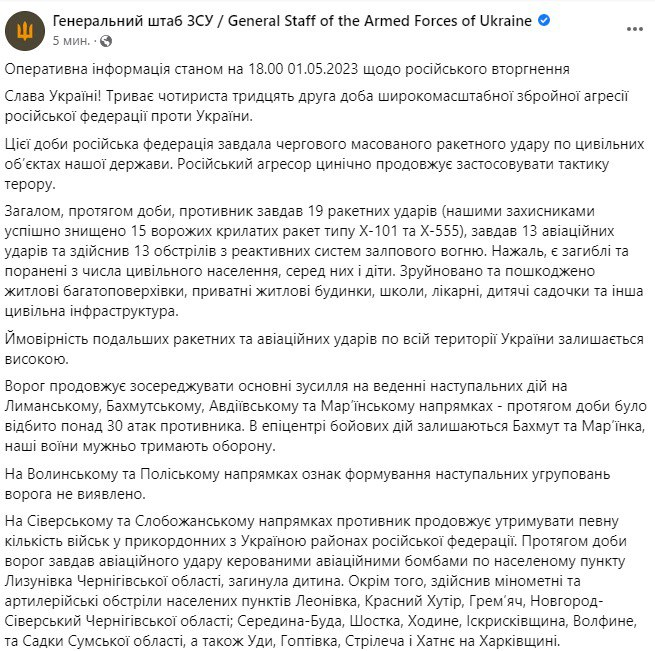 У понеділок, 1 травня, Генштаб Збройних сил України опублікував вечірнє зведення з фронту.