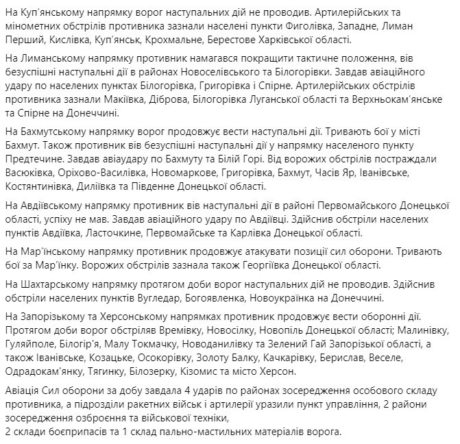 - Відбито понад 30 атак на напрямках: Лиманському – у районах Новоселівського та Білогорівки; Бахмутському – у Бахмуті, а також у напрямку Предтечино; Авдіївському – у районі Первомайського; Мар'їнському – у районі Мар'їнки.