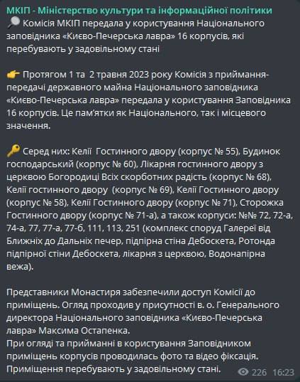 Мінкульт зазначає, що представники монастиря УПЦ забезпечили доступ Комісії до приміщень та всі приміщення перебувають у задовільному стані.