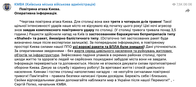 "За попередньою інформацією, у повітряному просторі Києва силами нашої ППО всі ворожі ракети знищені. За оперативними даними - без жертв серед цивільного населення та руйнувань житлових об'єктів чи інфраструктури", - заявив Попко.