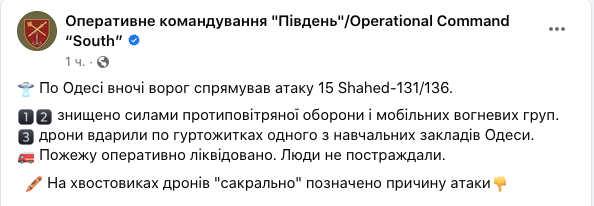 "По Одесі вночі ворог направив атаку 15 Shahed-131/136. 12 знищено силами протиповітряної оборони та мобільних вогневих груп. Три дрони вдарили по гуртожиткам одного з навчальних закладів Одеси. Пожежу оперативно ліквідовано. Люди не постраждали. На хвостовиках дронів" сакр. причина атаки", - повідомляє оперкомандування "Південь" та публікує фото дронів, на яких написано "Za Москву" та "Zа Кремль".