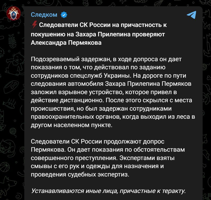 "На дорозі по дорозі автомобіля Захара Прилепіна Пермяков заклав вибуховий пристрій, який привів у дію дистанційно. Після цього втік з місця події, але був затриманий співробітниками правоохоронних органів, коли виходив з лісу в іншому населеному пункті", - йдеться у заяві Слідчого комітету..