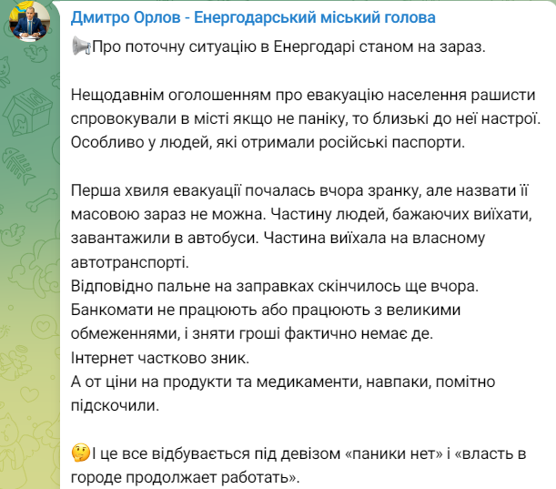 Мер Енергодару Дмитро Орлов повідомляє подробиці російської "евакуації" мешканців окупованого Енергодару - міста, де знаходиться Запорізька АЕС.
